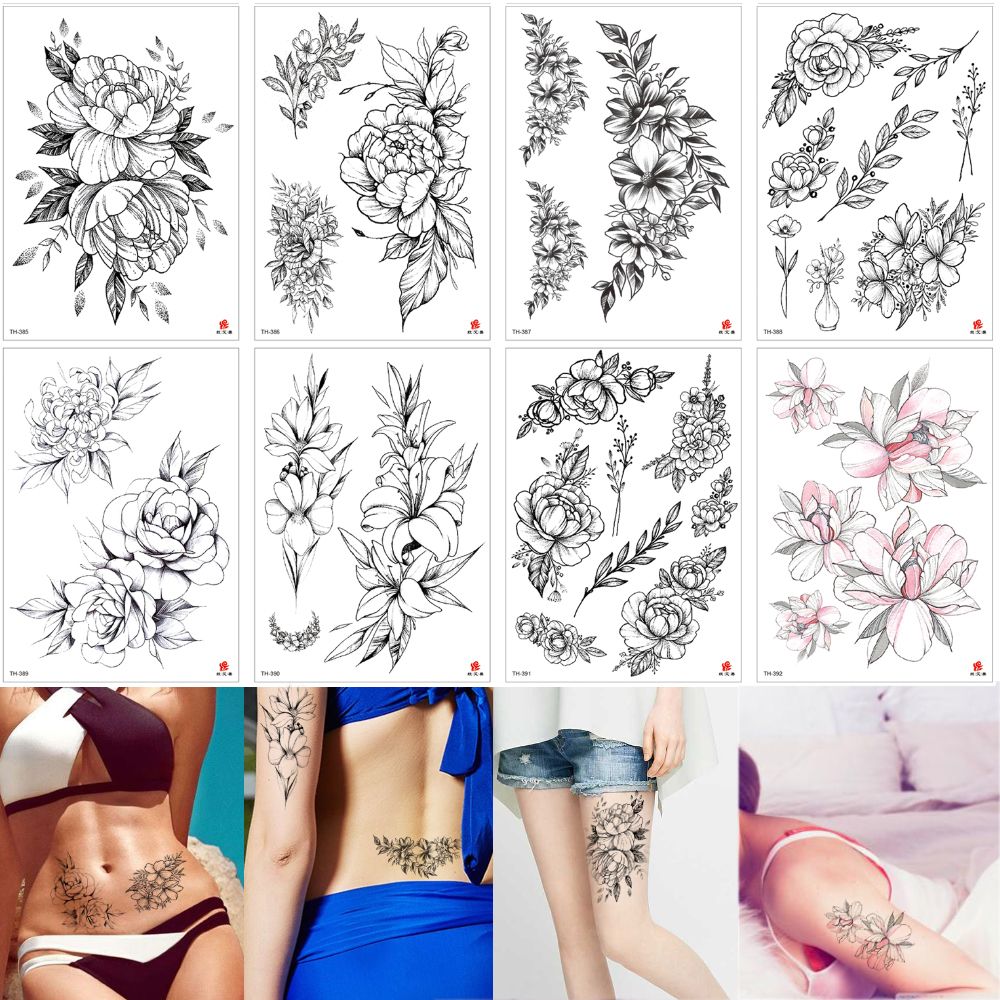 Fashion Black Small Sketch Flower Tattoo Temporary Peony Floral Body Art For Women Waist Chest Leg Arm Jewelry Tattoo Sticker Transfer Paper