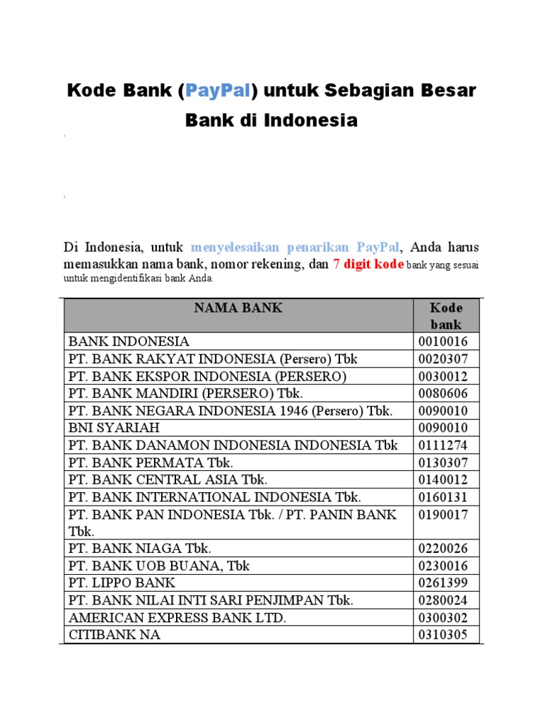 Silahkan cek jika ada kesalahan tekan tombol edit untuk memperbaiki. Daftar 7 digit kode bank di indonesia untuk daftar paypal 1205 pm dapat uang dari internet etc how to hai sahabat sitakom bagi para pemula dalam penggunaan paypal di indonesia untuk menyelesaikan penarikan paypal anda harus memasukkan nama bank serta nomor rekening dan 7 digit kode bank yang sesuai dengan rekening bank yang anda miliki.