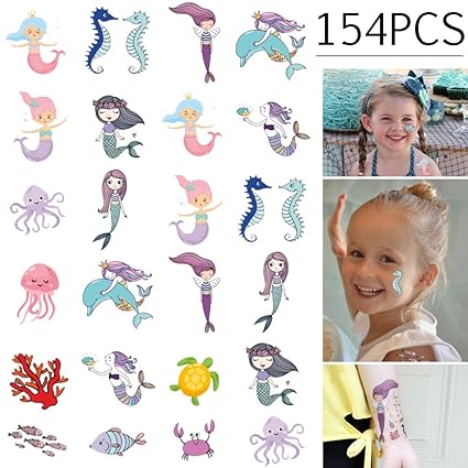 154pcs Mermaid Tattoos Temporary For Kids Ocean Under The Sea Summer Pool Birthday Party Decorations Supplies Favors 8 Sheets